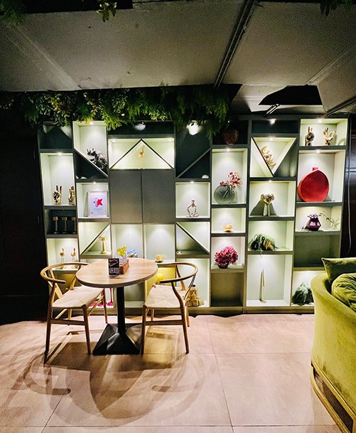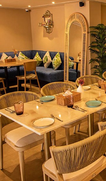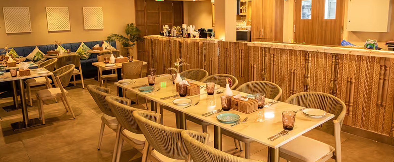 Relax and unwind in our spacious dining area, adorned with rich colors and textures inspired by Indian culture.Discover subtle design elements that reflect the rich heritage of India, adding a touch of authenticity to your dining experience.